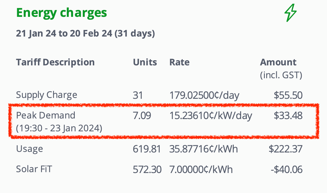 Demand charge is applied on top of the familiar per-kWh usage charges, and is calculated on your highest level of consumption measured during the 'demand window', which is typically between 3pm and 9pm.