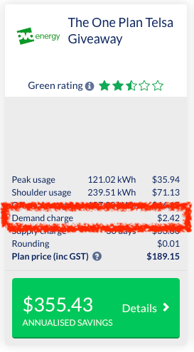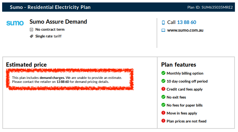 EME helpfully points out that an extra and unknown Demand charge amount will be added to the calculated price for this planVEC reports: ‘This plan includes demand charges. We are unable to provide an estimate’