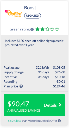 Be aware that retailers can make GreenPower available for some, or all of your kWh consumption. All of thee participating retailer offer a 100% option, but only some of them offer lesser proportions. If you choose a lower proportion — eg 20% GreenPower — then Bill Hero will display only the plans from those retailers that support a 20% GreenPower option.