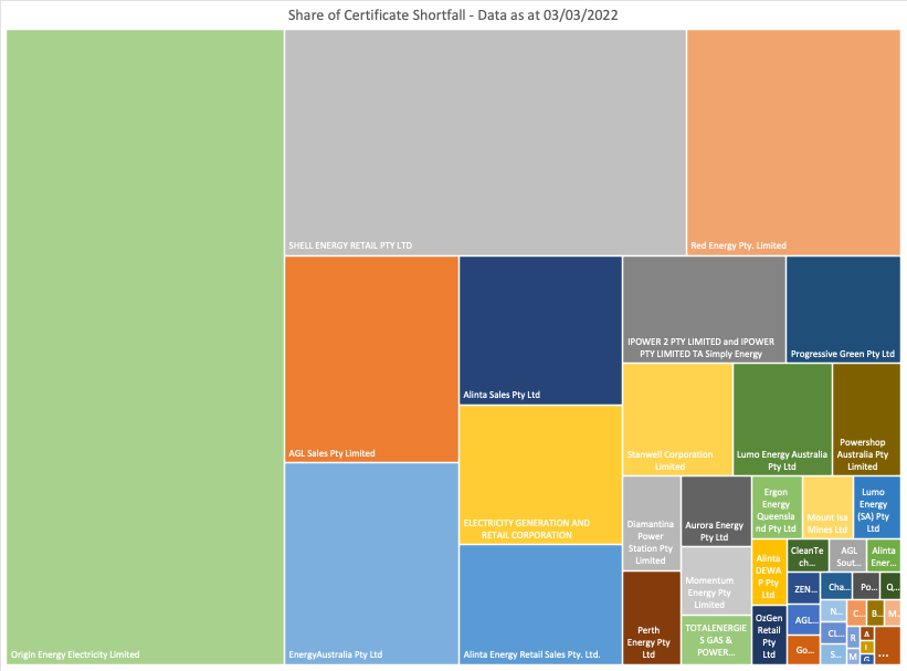 Energy market participant share of total LGC renewable certificate shortfall. Source: Clean Energy Regulator Certificate shortfall register