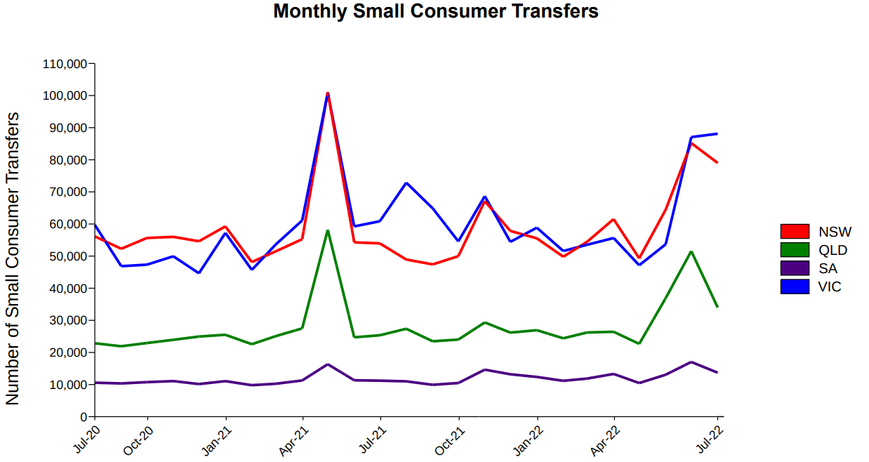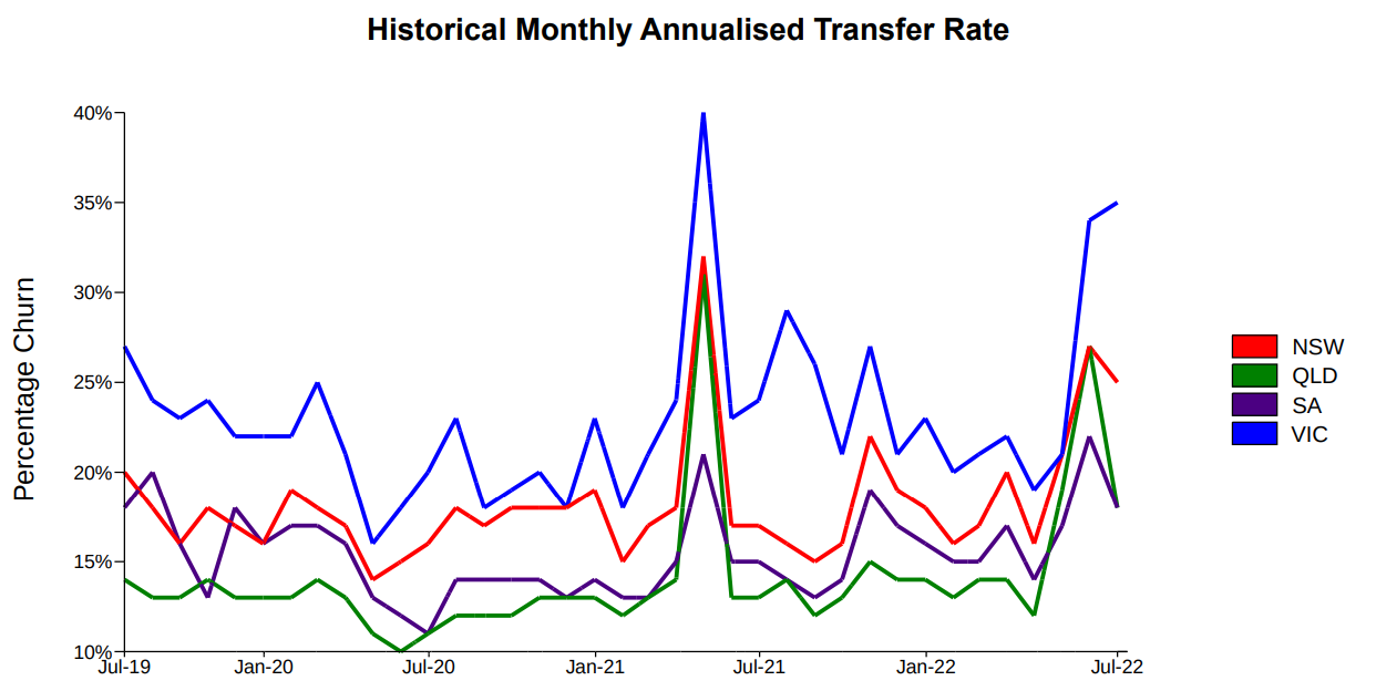 On an annualised percentage churn basis, Victoria would see 35% of the entire market switch providers if this current monthly switch rate were maintained for a year, well above the other states.
