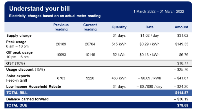A breakdown of how the amount due was calculated (the understand your bill section), including by reference to billing period (date-to-date) and number of days; previous and current meter reading; usage per tariff type; rates/tariffs, ; charges; credits; discounts; amounts deducted, credited or received under a government-funded energy charge rebate, concession or relief scheme or under a payment plan; GST; and Solar exports.