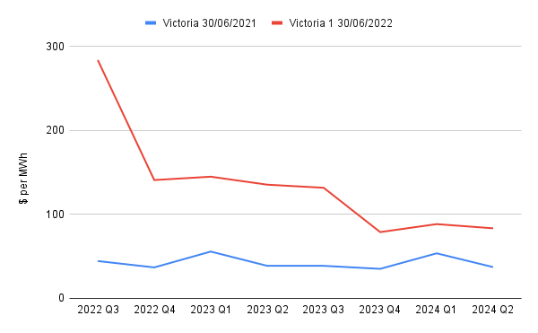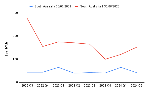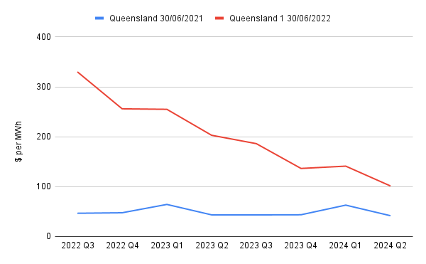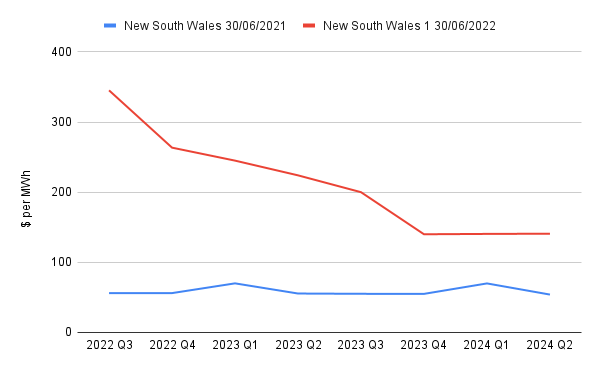 NEM electricity futures pricing $ per MWh at 30/6/2021 in Red, vs pricing for same periods as at 30/6/2022 in Blue. AER data