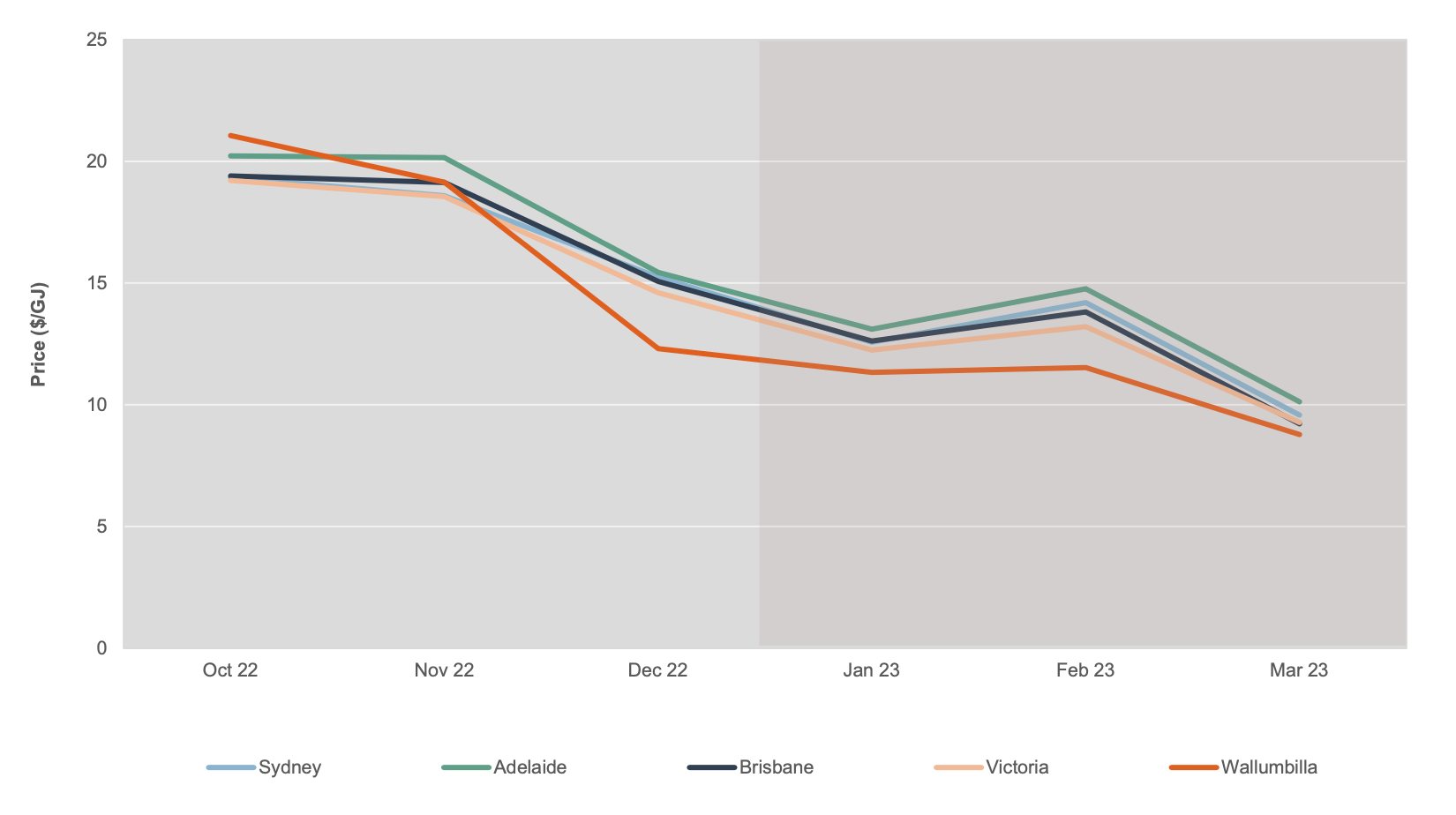 After a tumultuous year, Asian gas prices have decreased from over $40/GJ to below $20/GJ in March 2023, and maintenance outages for the gas export pipelines for Shell's Queensland Curtis LNG operation meant some gas intended for export became available to domestic consumption, driving down the local spot price.