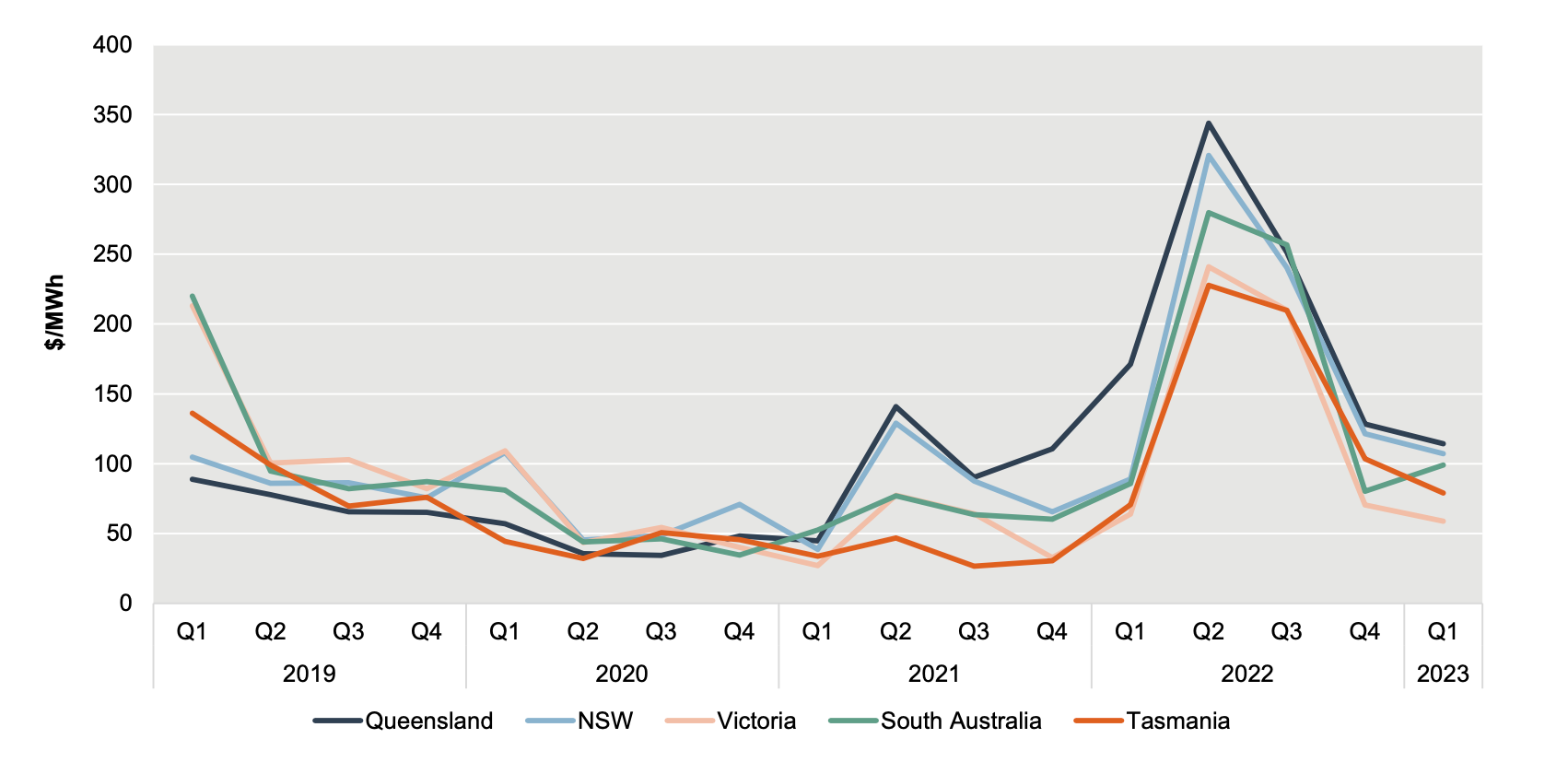 Despite increased electricity demand, average NEM spot prices over Q1 2023 were lower across all regions except South Australia.