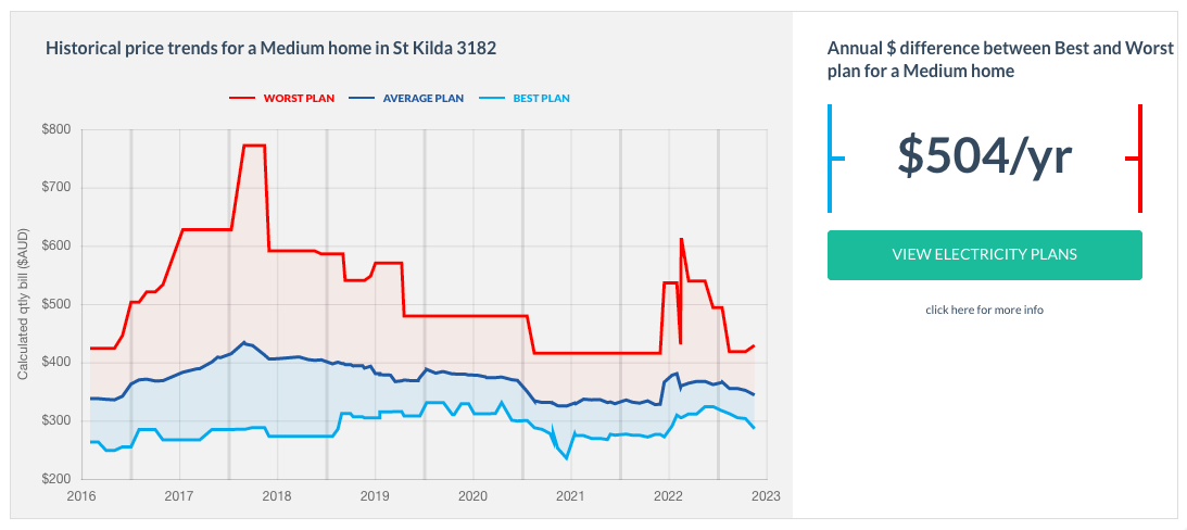 This is a typical price movement chart for St Kilda, in the United Energy distribution zone in Victoria — although the 'high-price' available in the market, which is typically set by the default offer, shows considerable variation, the low price, determined by competition between retailers, displays less volatility.