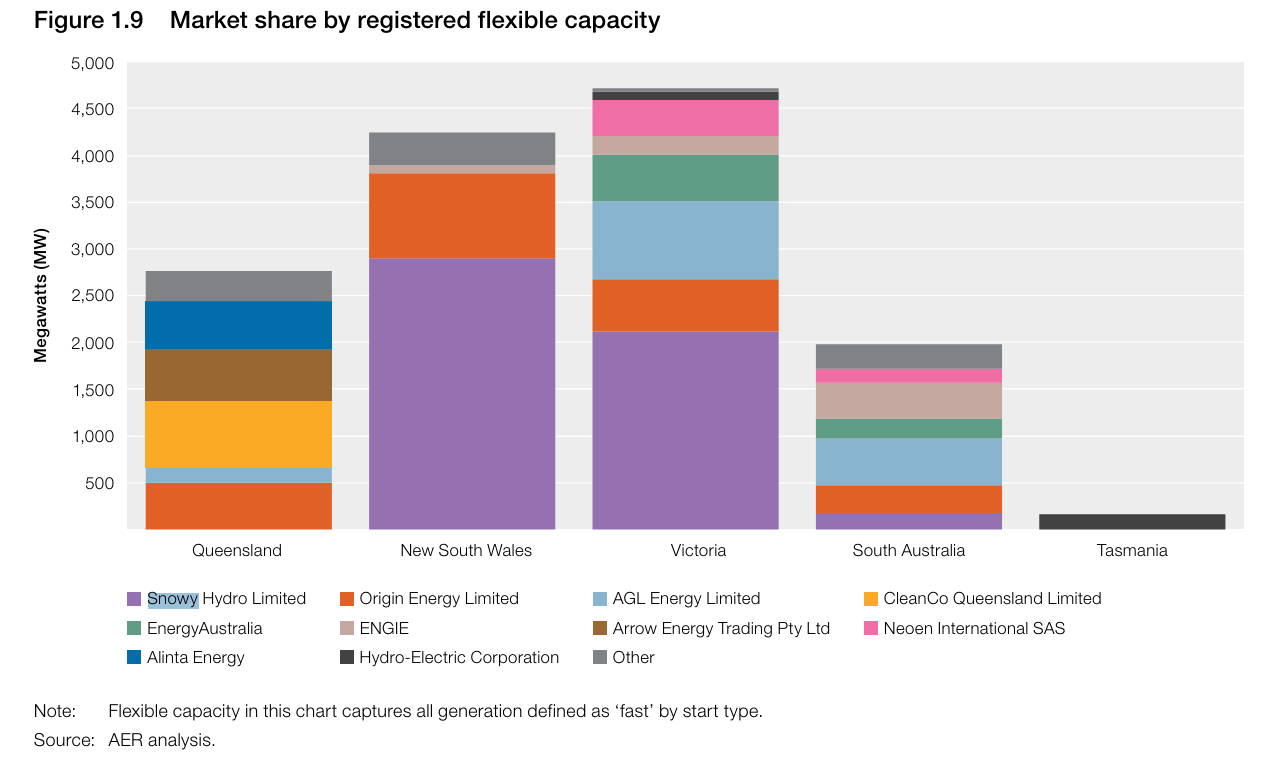 Snowy Hydro dominates the register of flexible (fast-start) generation capacity in Victoria and NSW. Flexible capacity will become more critical for managing intermittent renewable generation as coal retirements progress.