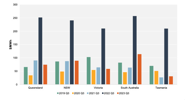 Average Q3 electricity spot prices in NEM by year: Source: AER analysis using NEM data.