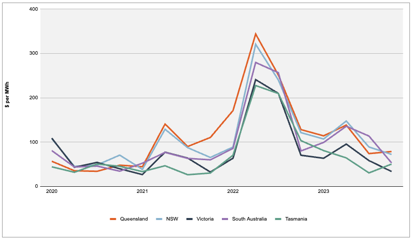 Volume-weighted average quarterly wholesale spot prices. Prices weighted against ‘native’ demand - excludes demand met by rooftop solar PV. Source: AER Wholesale Market Report Q4 2023