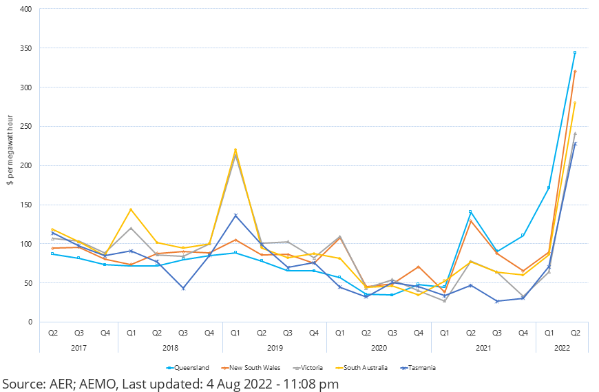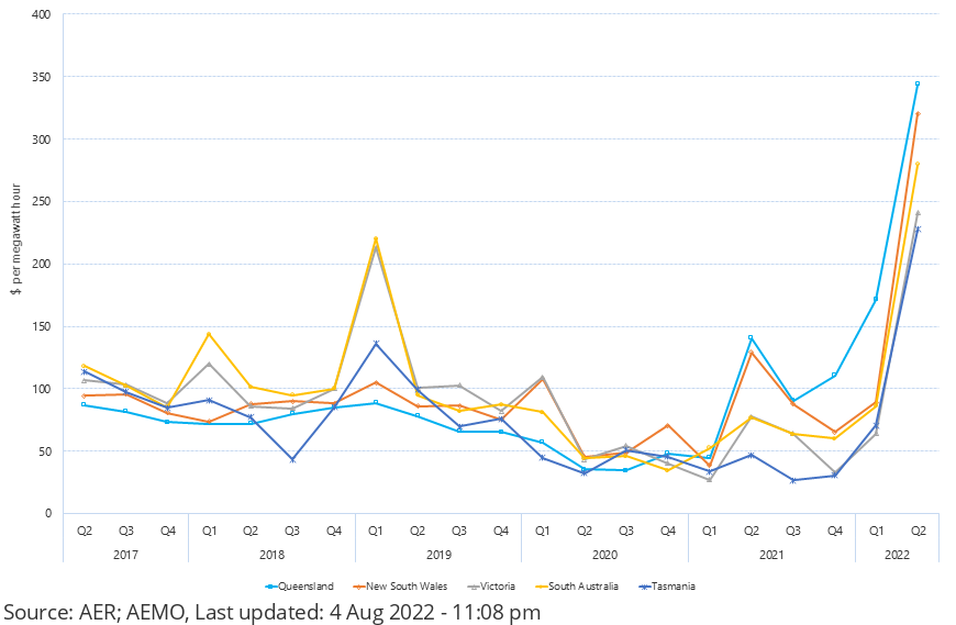 A quick glance at the quarterly average wholesale prices across the NEM shows that we really did experience a wholesale price decline from 2017 through 2020, but in 2022 we've seen very dramatic increases.