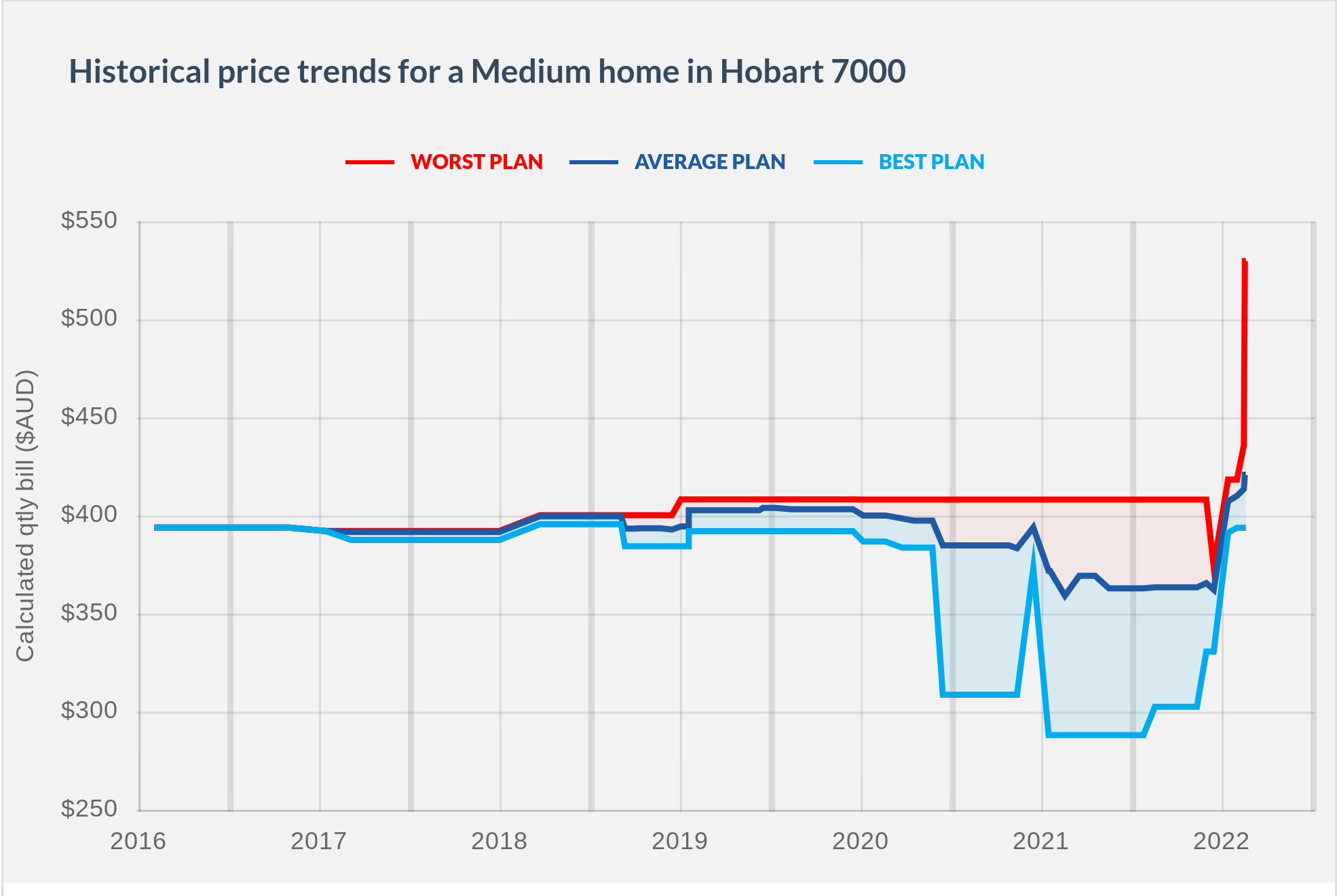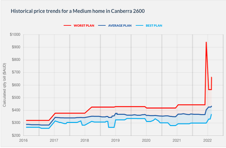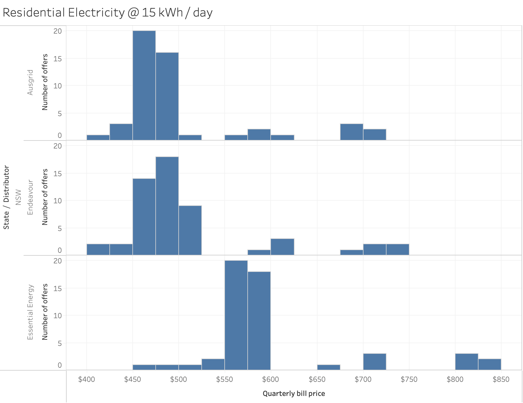 Here's an example of the distribution of plans in NSW for 'average' households consuming 15 kWh/day under a single rate energy tariff. The price ranges vary by distribution zone, because the network and distribution costs are different for each zone.