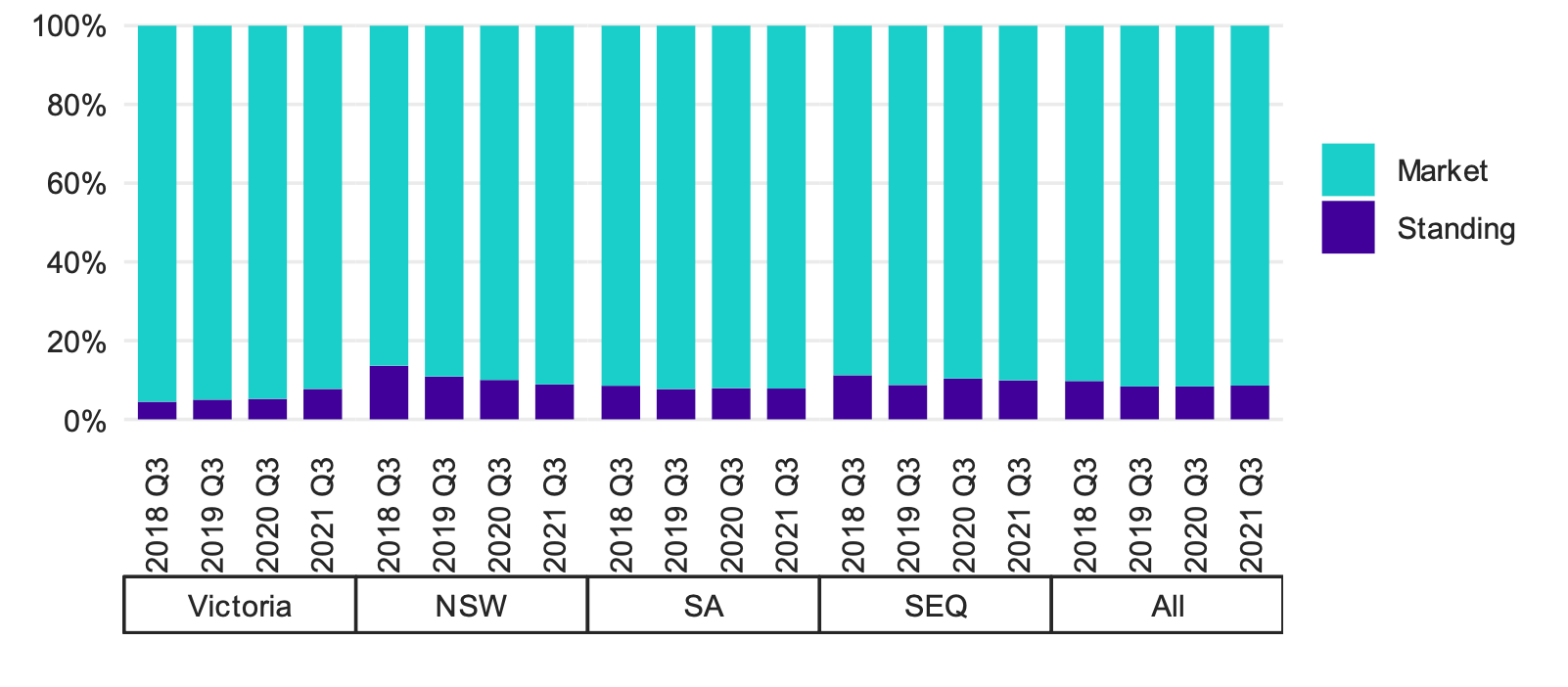Proportion of residential customers on market and standing offers. Source: ACCC Inquiry into the National Electricity Market—May 2022 report
