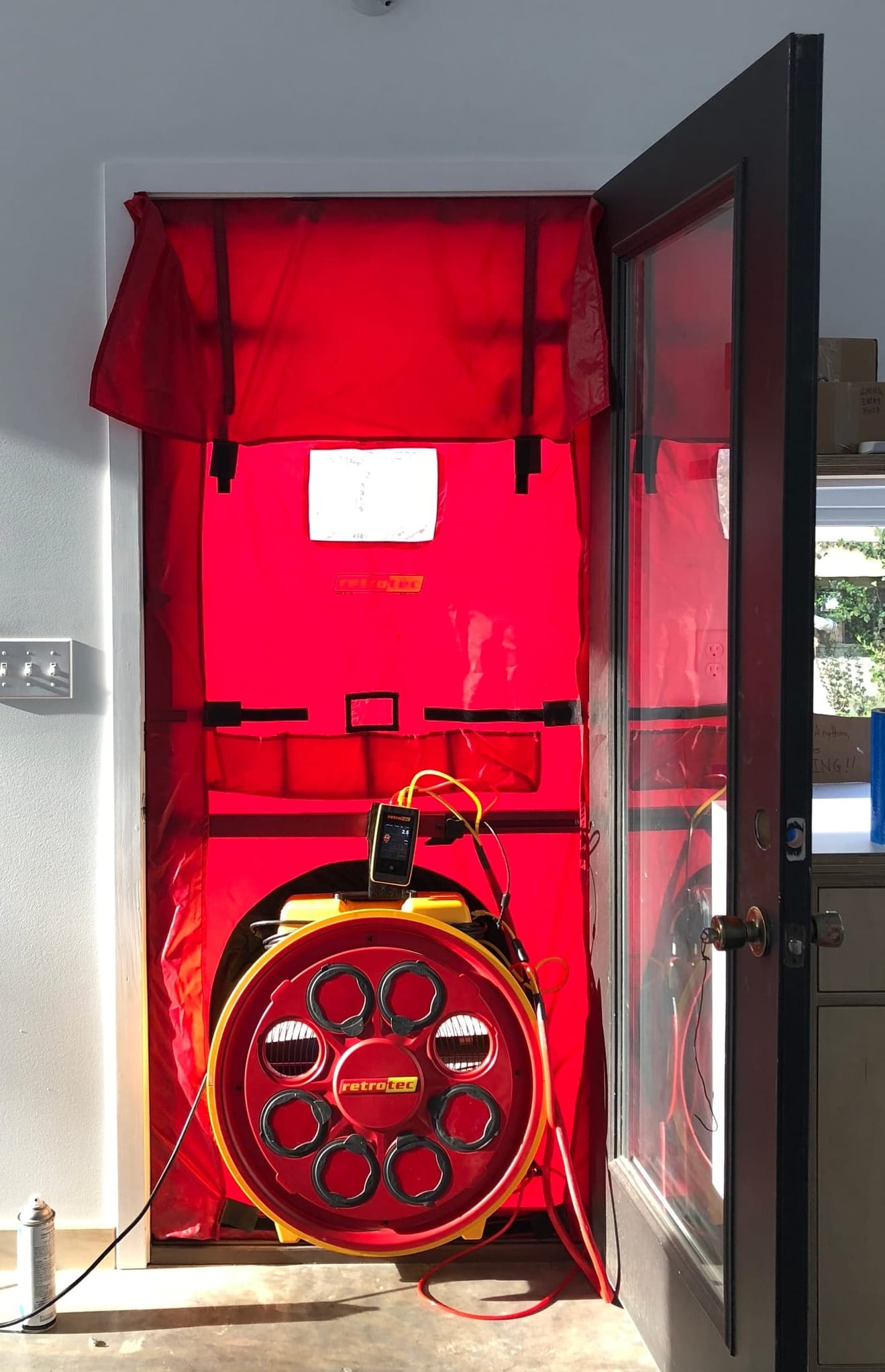 Blower door testing quite literally involves installing a fan blower into an external door frame.